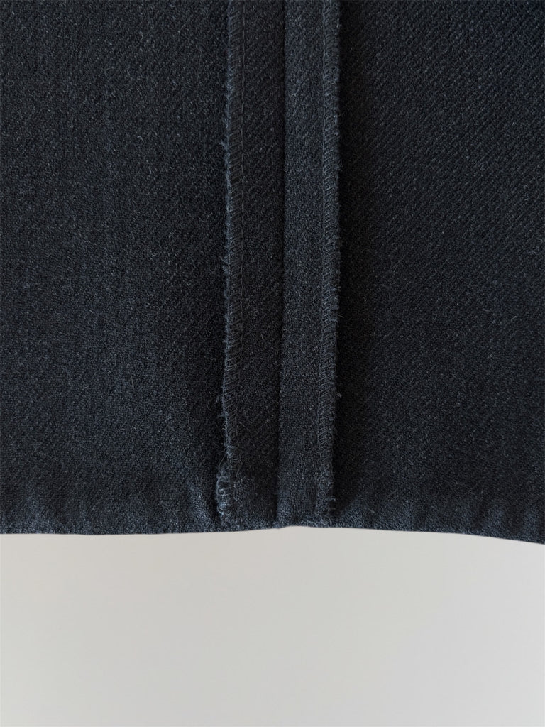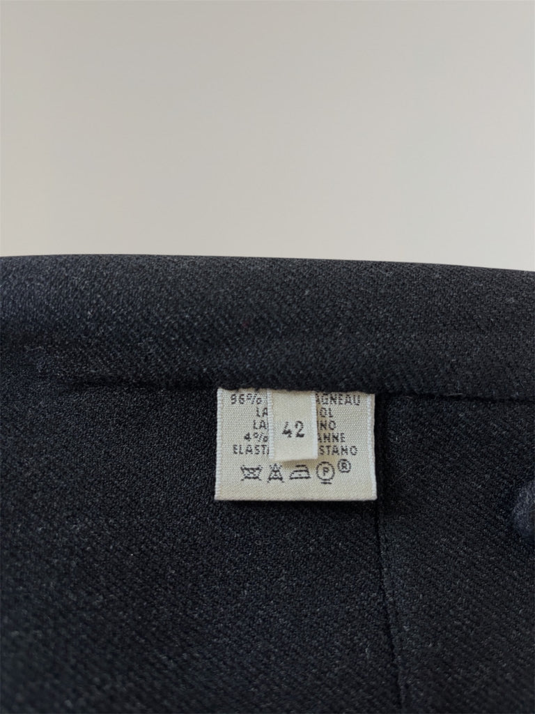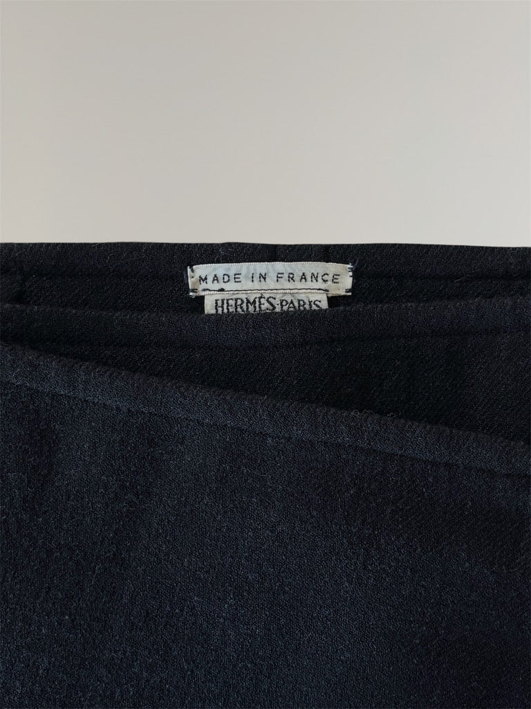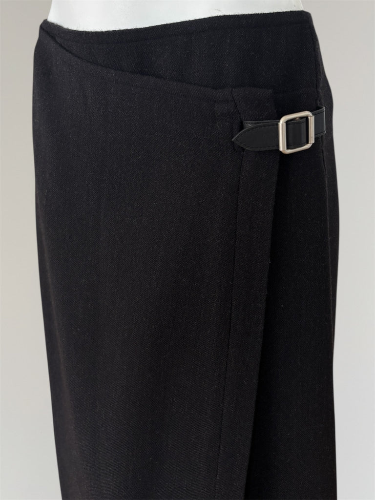 Hermès AW2000 by Martin Margiela mid-length wrap lambwool skirt with a leather buckle and one hidden six-hole button with stitching forming a subtle 'H'. Beautiful faded black shade with slight stretch in the fabric. Seen on the runway in crocodile leather. Unoriginal seam in the back, kindly refer to the measurements. Slight feel of wear in the fabric, overall in a very good condition.
