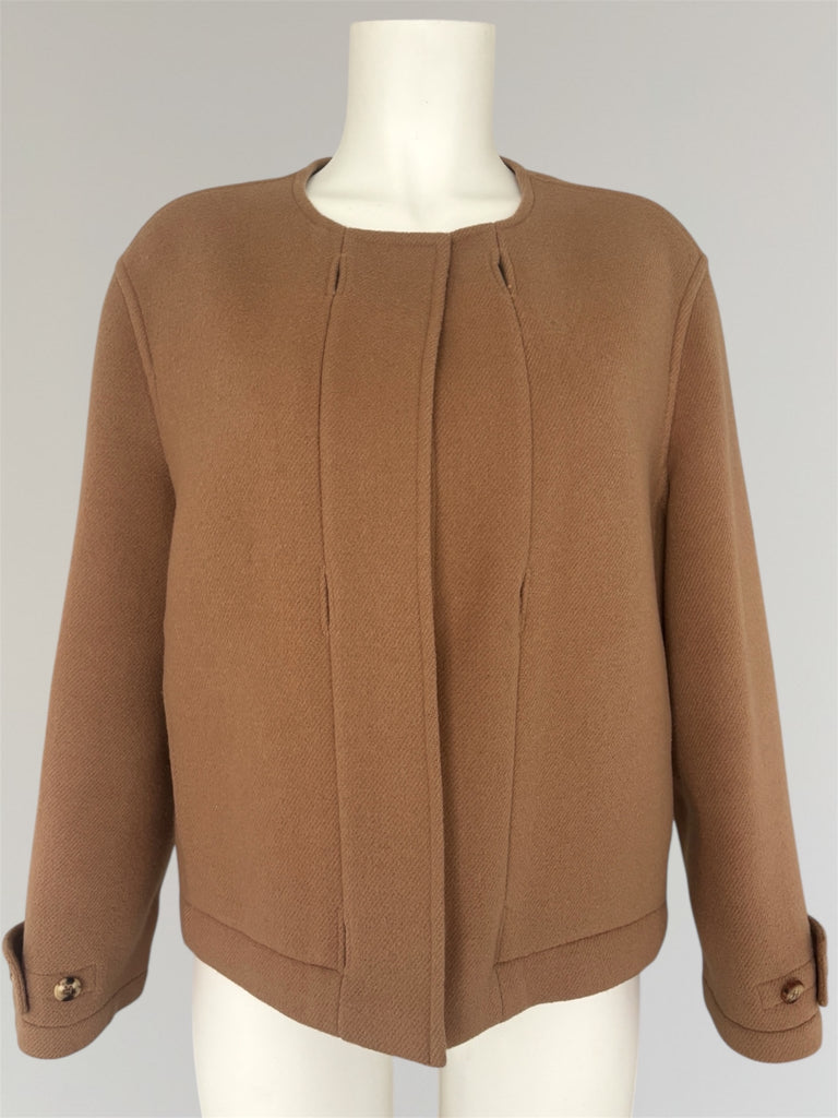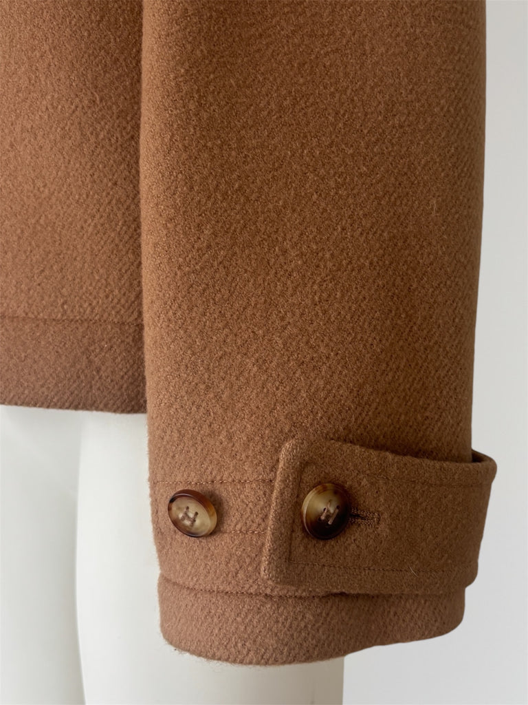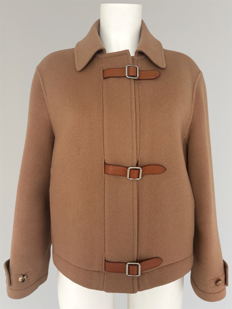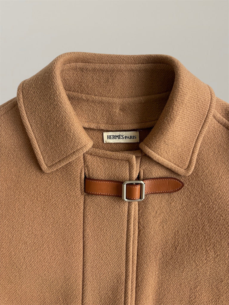 Transformable short wool- and cashmere coat from Hermès AW2000 collection with removable buckles and collar allowing the coat to be worn in a number of different ways and occasions. Iconic six-hole buttons forming a subtle 'H' in sleeves and to attach the collar. Seen both on the runway as well as in Le Monde d'Hermès. In a good used condition without any pieces missing, some natural feel and signs of wear in the fabric and a small defect in the collar as seen in the last photo.