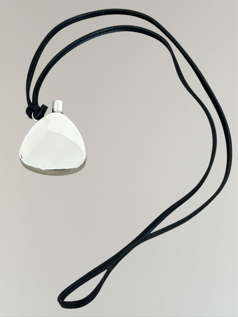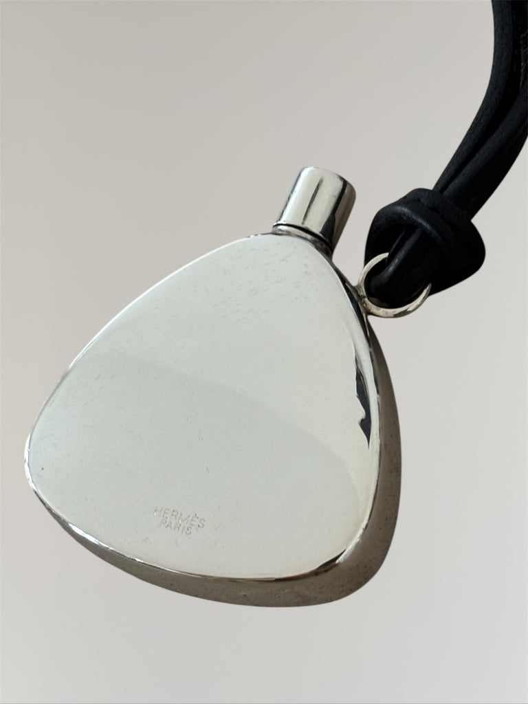Hermès perfume bottle pendant in sterling silver with black leather cord. Very minor natural signs of wear, otherwise in a very good condition.