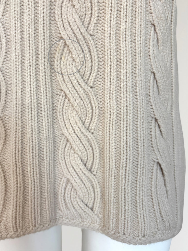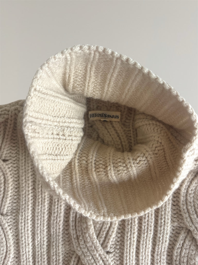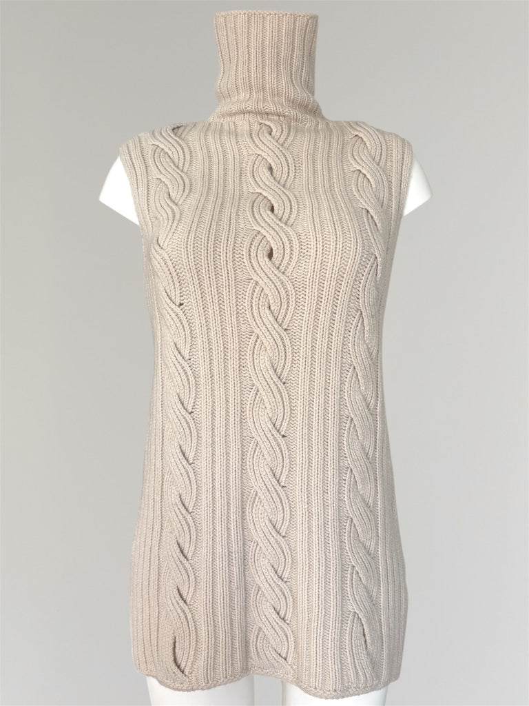 Sleeveless cable knit turtleneck pullover from Hermès AW2000 collection. Knitted round without seams, a technique Martin Margiela applied to clothing at Hermès, traditionally used to knit gloves. Note that if the pullover is worn tight or with a bigger bust, the cables will "open" slightly revealing skin or top underneath. Yellowing inside the collar that is not visible when wearing, very fade spot in the front as seen in the last photo.