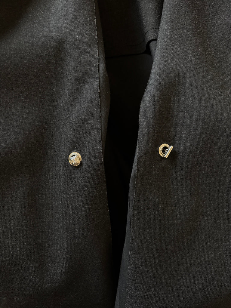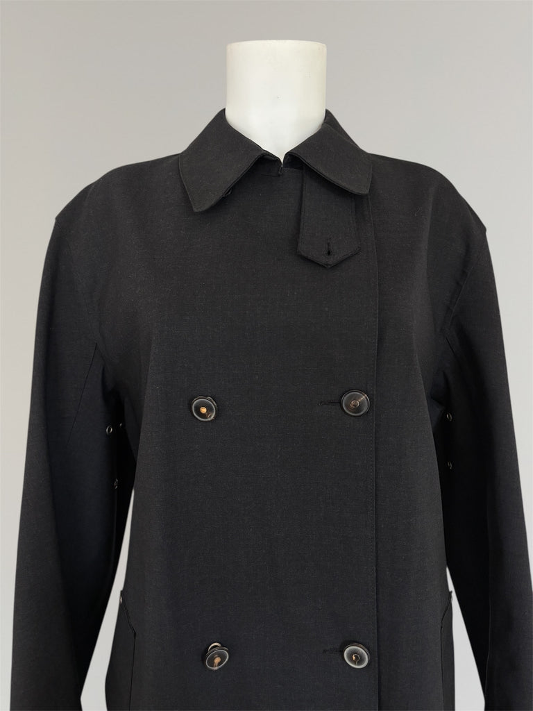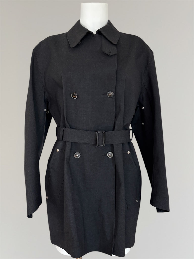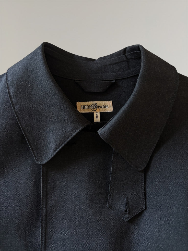 Short Mackintosh trench coat from Hermés AW2001 collection by Martin Margiela with belt, removable buttons and -throat latch. Made from iconic water repellent Mackintosh wool and cotton fabric in a fade black shade. Worn on the runway without the buttons. Yellowing inside in the brand label, two buttons from the top are missing, back of two buttons have been repaired making them unremovable. Overall appearance remains very good. See the matching hat here.