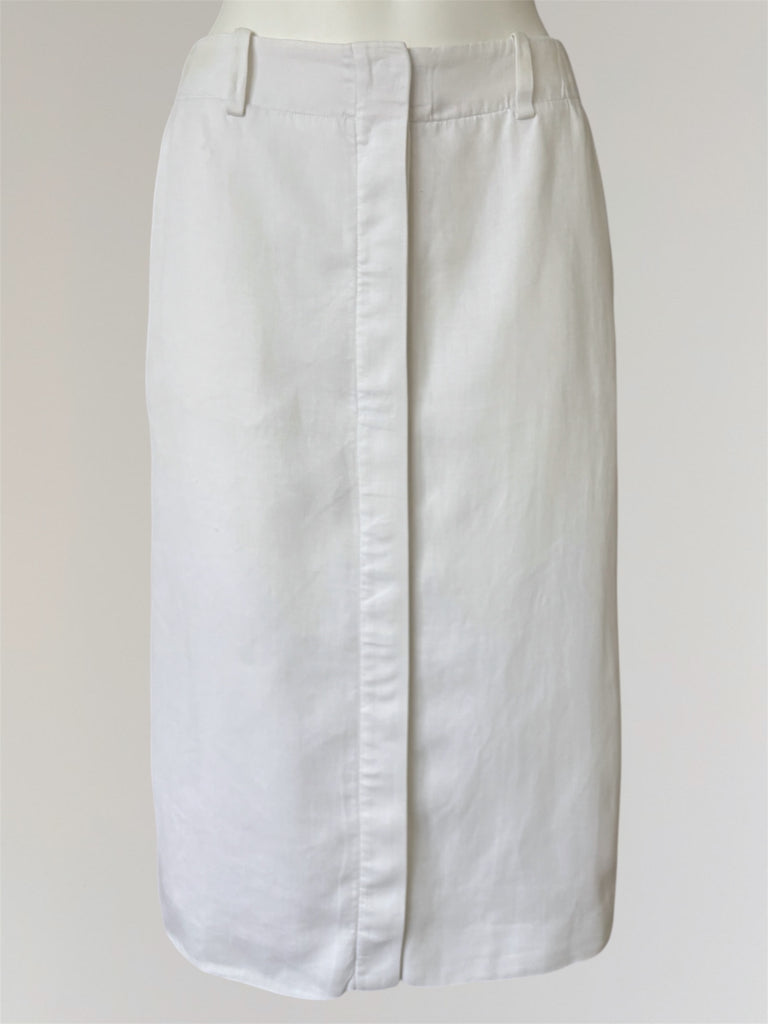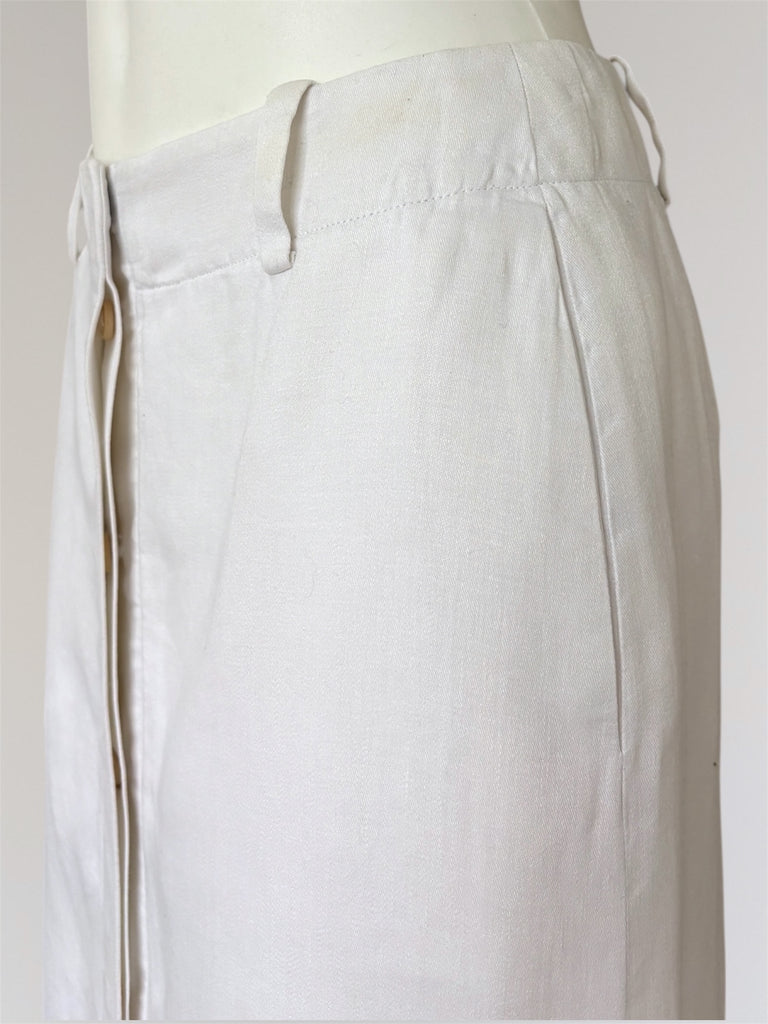 Mid-length linen skirt from Hermès SS2002 collection with iconic hidden six-hole buttons forming a subtle 'H'. Seen on the runway and similar style seen also in SS1999 collection. Fully lined in silk. Minor darkening at the waist and very minor spots in the lining, overall condition remains very good